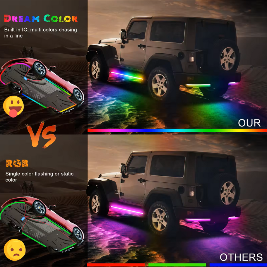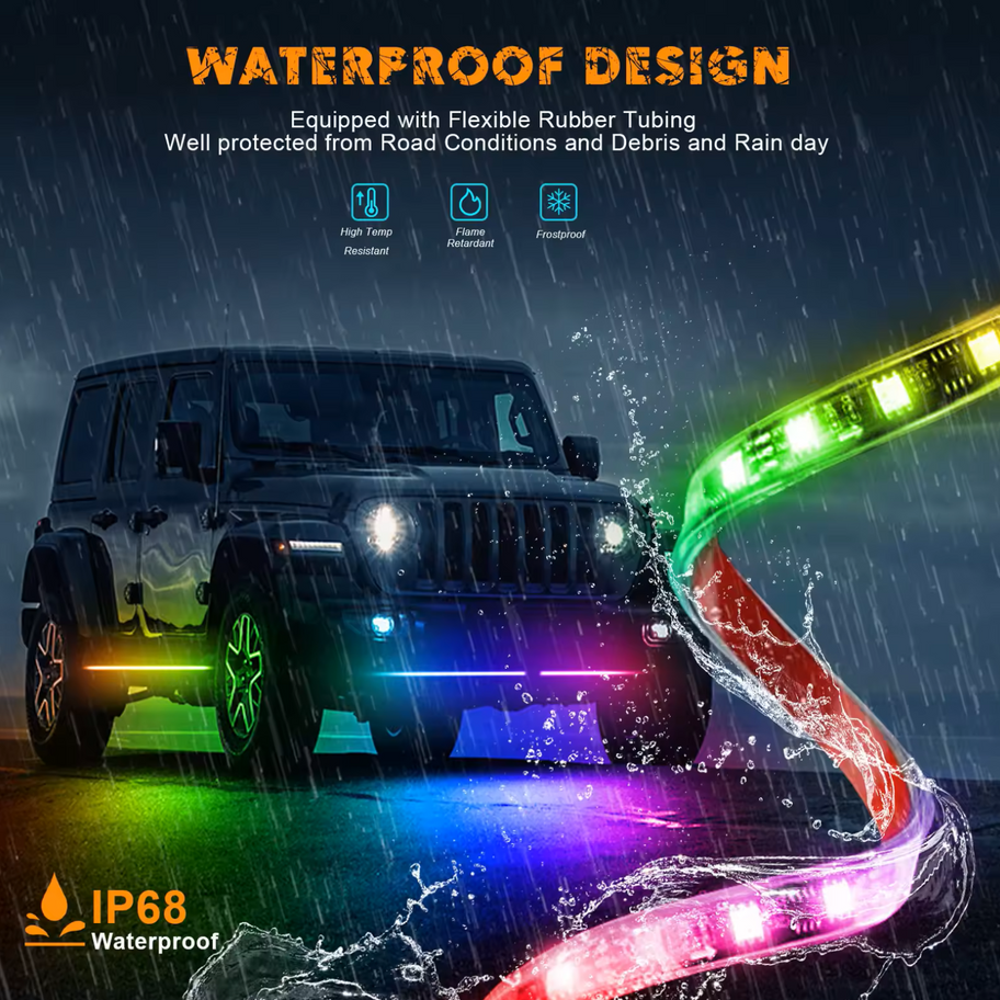 Introducing our LED RGB Under-glow kit, the ultimate addition to any vehicle looking to make a statement on the road. This full RGB kit allows you to fully customize your under-glow lighting experience, with millions of color options to choose from. Plus, with Bluetooth control, you can easily adjust the colors and patterns right from your smartphone. The kit is completely customizable, allowing you to create the perfect lighting effect for your car or truck. With easy installation and weatherproof design, this under-glow kit is the perfect addition to showcase your style on the road.